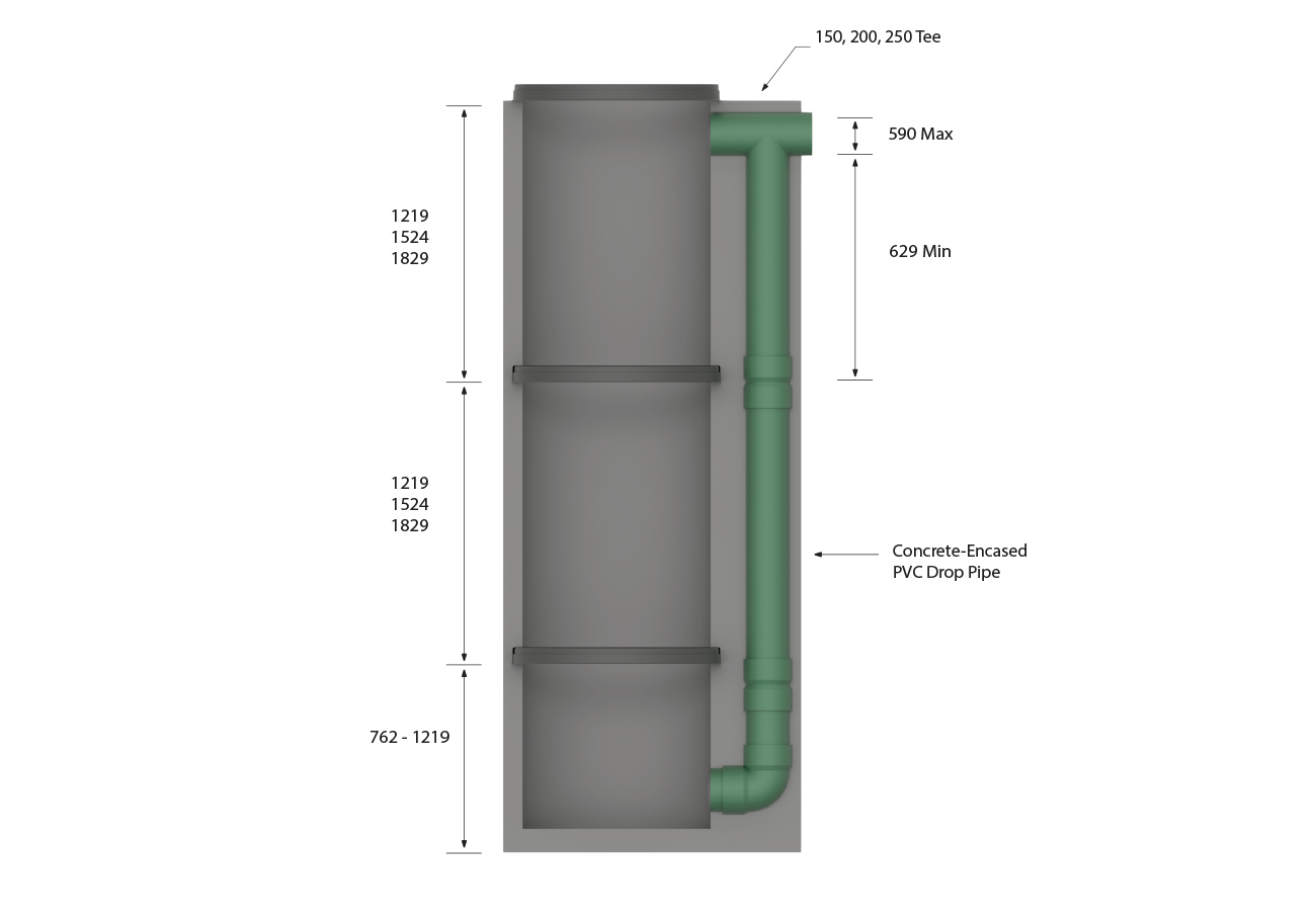 Concrete shall be placed to undisturbed ground and the outside face of the maintenance hole, but there shall be a minimum of 150mm of 15mpa concrete around the drop pipe.