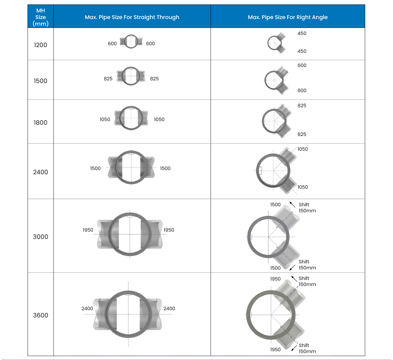 | Pipe Size | 300 | 375 | 450 | 525 | 600 | 675 | 750 | 825 | 900 | 975 | 1050 | 1200 | 1350 | 1500 | 1650 | 1800 | 1950 | 2100 | 2250 | 2400 |