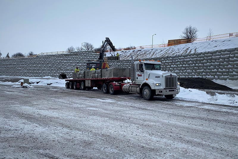With a large berm separating the new fulfillment center and the exit ramp off Highway 416 it was important that a wall be constructed to limit any chance of erosion into the newly constructed parking lot. Stone Strong’s strict gravity wall was a great option as there was limited space between property and property line, the addition of tiebacks would have not been a practical option.
