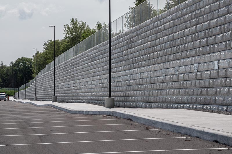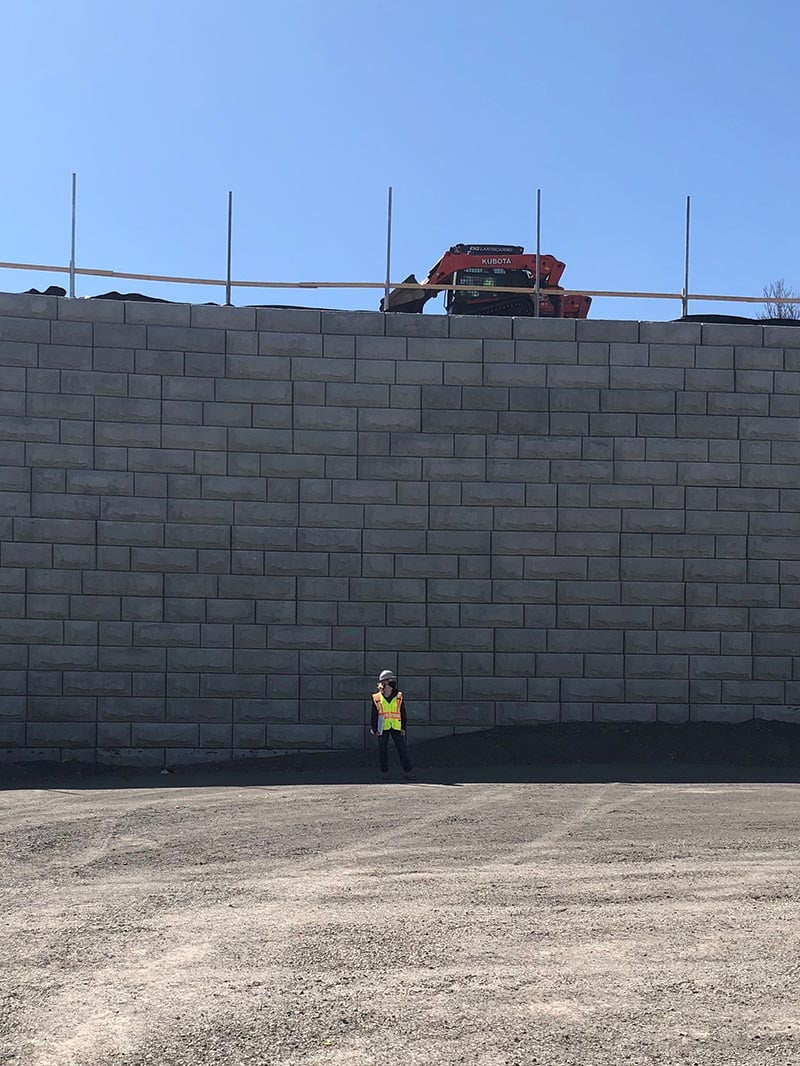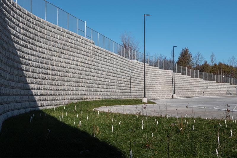 With a large berm separating the new fulfillment center and the exit ramp off Highway 416 it was important that a wall be constructed to limit any chance of erosion into the newly constructed parking lot. Stone Strong’s strict gravity wall was a great option as there was limited space between property and property line, the addition of tiebacks would have not been a practical option.