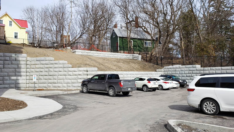 The versatility of the Stone Strong product shone brightly on this terraced wall. With tight site conditions, Stone Strong retaining wall provided the benefit of not requiring a geogrid. The versatility of the hollow blocks allowed for a quicker, easier, and less costly installation process.