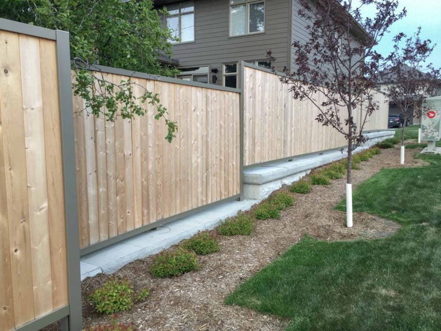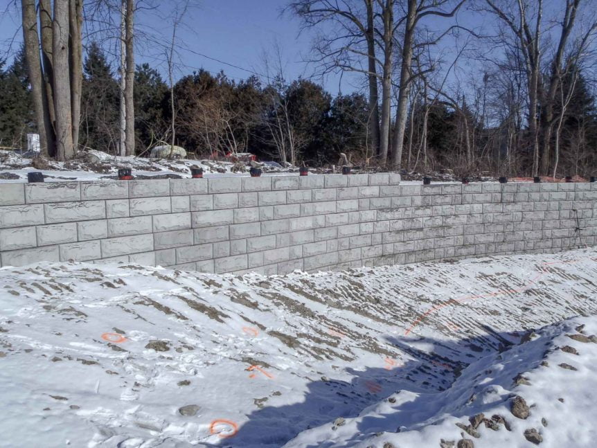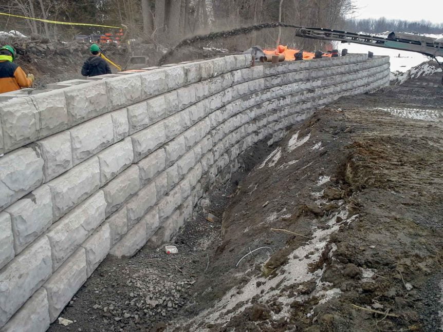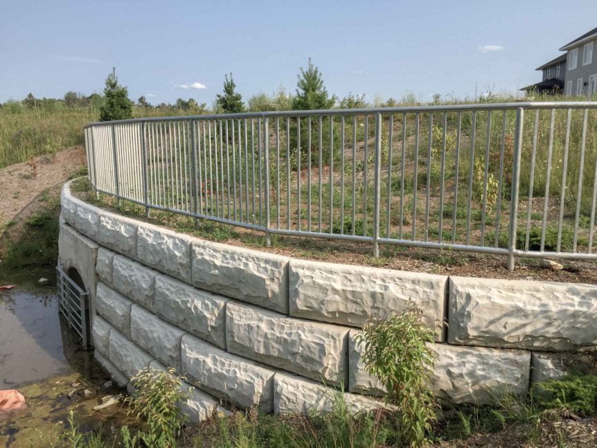 Using a stone-slinger to back fill the rear side and each row of the Stone Strong wall was a major time saver for them during the construction of this pond. Directly beside the above wall, the engineer designed the Stone Strong retaining wall to be built around this outlet culvert. The designer and contractor took advantage of the blocks hollow cavities to pre-place sonotubes. This saved the contractor from having to dig any holes to install the fence posts.This pond has an elliptical pipe inlet, as well as a box culvert outlet structure. Both structures have the retaining wall acting as a wing wall on either side of the pond. The Stone Strong dual face block and cap were used between the roadways and houses. Holes were cored through the caps and fence posts were installed along with the fence.