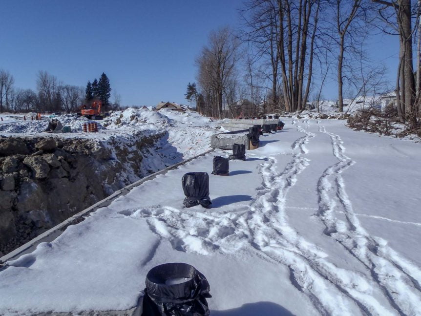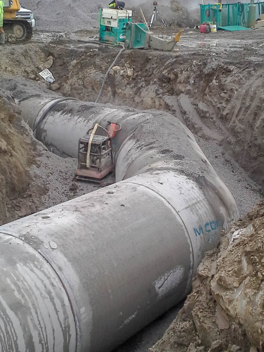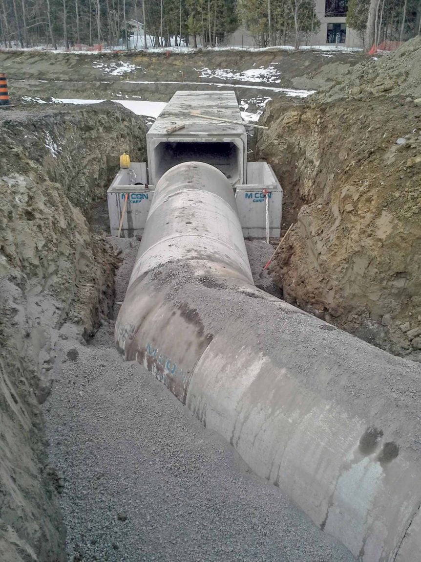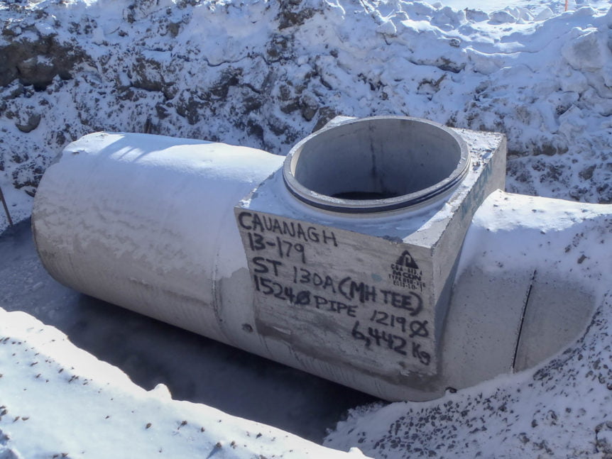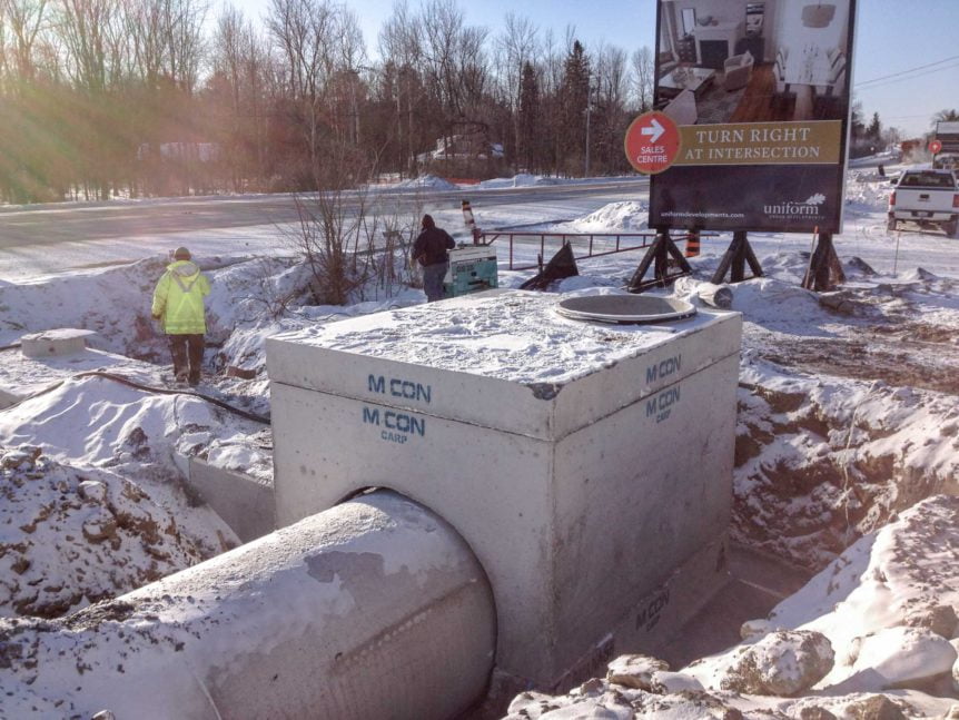 MCON was contracted by Cavanagh Construction to produce the precast underground utilities for The Orchard subdivision. With very restrictive site conditions and low final grade elevations, custom structures and designs were required to accommodate the volume of drainage. After evaluating the final design, it was determined that manhole pipe tees were the best solution. With approval from the city, consultants, and owners, we were able to produce these structures in a timely manner to expedite the construction phase. The contractor was also contracted to build walls using our Stone Strong product.