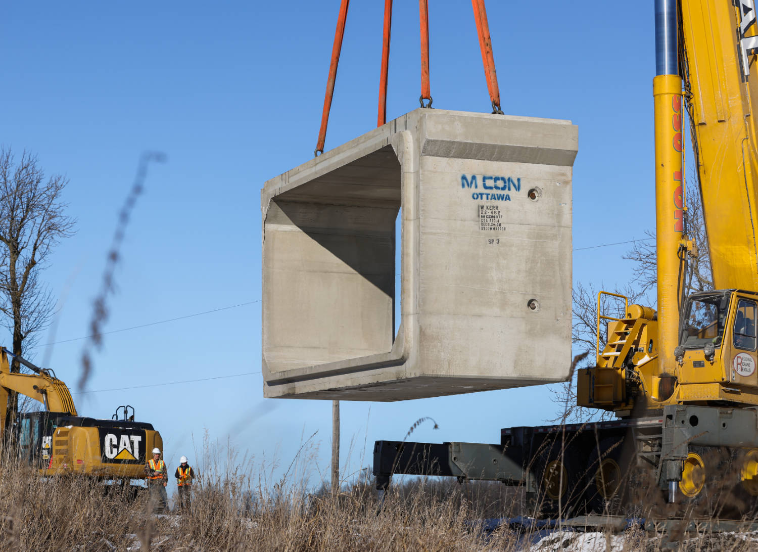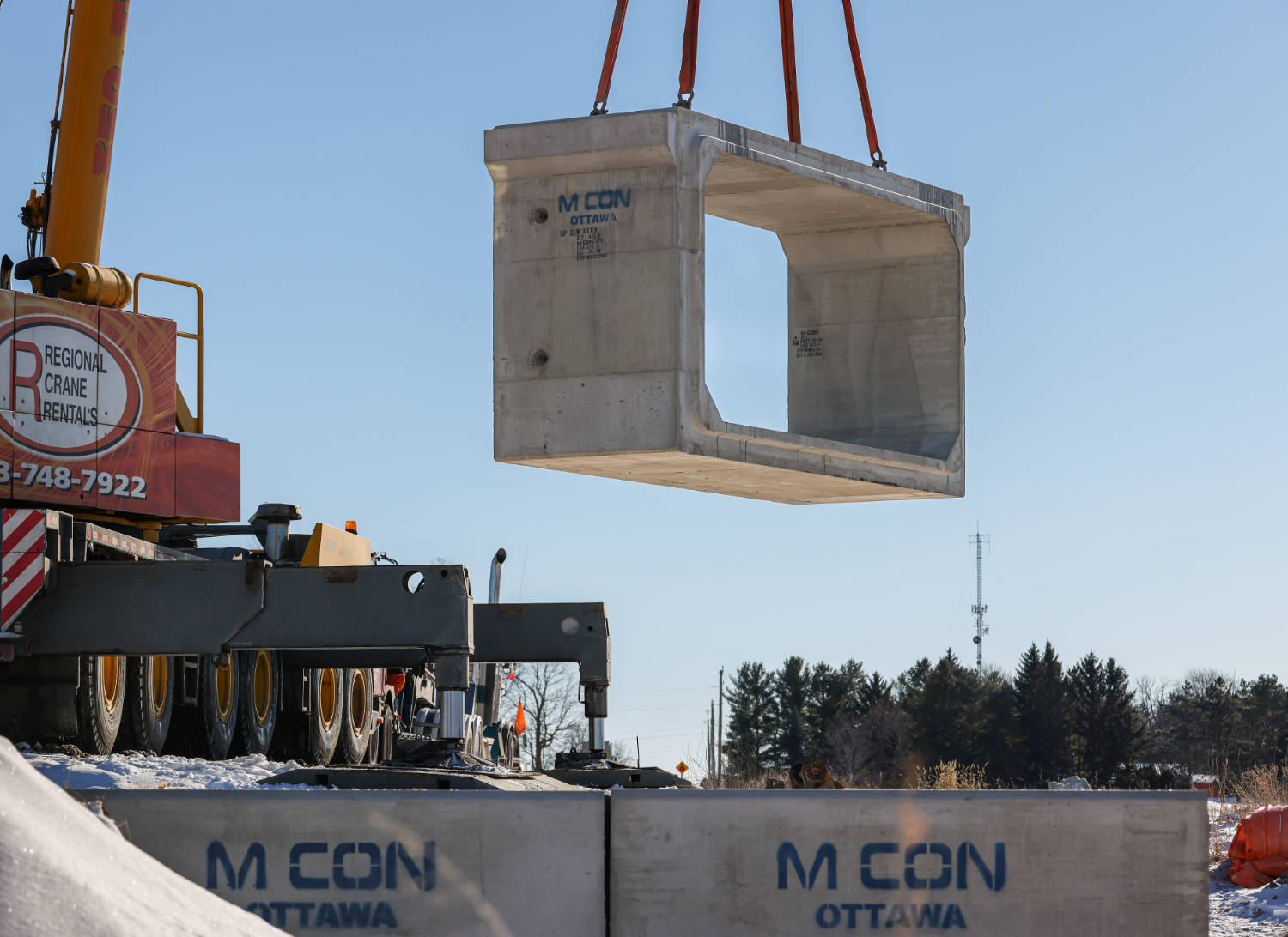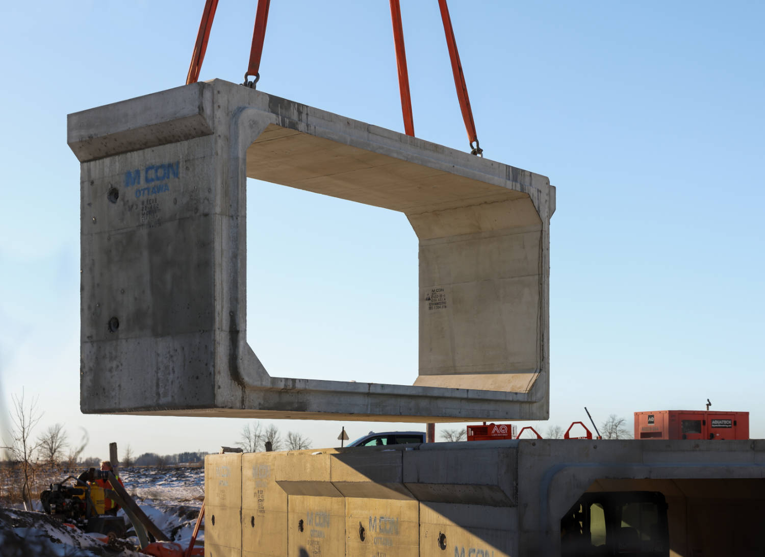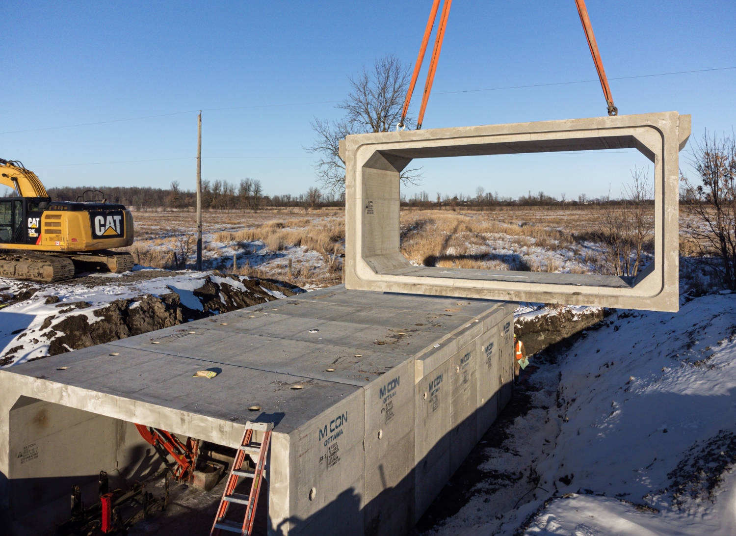 The Township of North Dundas sought to upgrade the Cayer Road Bridge in order to ensure a stable road surface and a steady water flow for many years to come. The replacement plan for the Cayer Road Bridge, developed by Jacobs Engineering Group in collaboration with the township and Willis Kerr Contracting Ltd., called for a new precast box culvert to take the place of the existing single-span concrete rigid frame bridge. For this application, a box culvert with a 5700 mm span and 2700 mm rise was selected.
