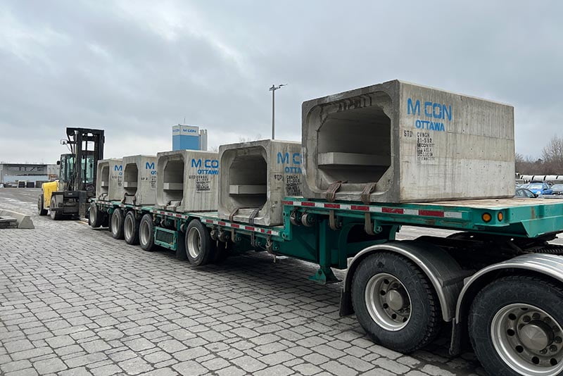 The new channel was required to pass under Flagstaff Drive, a main roadway within the subdivisions. To pass the 100-year flows the hydraulic design of the channel required twin 800 mm diameter CSP culverts. Given the importance of this roadway, CSP was changed to precast as the material of choice to ensure the maximum service life of this critical infrastructure. A precast concrete box culvert with a 1200 mm span x 900 mm rise was selected. The culvert was produced and designed by MCON Products of Ottawa, according to OPSS 1821 standard as well as CHBDC.