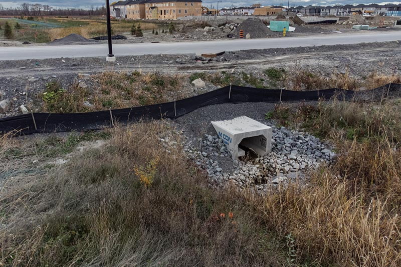 As the City of Ottawa continues to expand, more challenges are encountered given that the prime land has been developed and the remaining developable land has more restrictive characteristics such as flood plain restrictions and environmental habitat considerations. In the case of the Mattamy Homes Half Moon Bay West and Glenview Homes Flagstaff subdivisions, an existing channel that primarily served to convey flows from the swamp of the Cambrian Woods to the Jock River had to be realigned. The realigned channel would replace the old conveyance route, while providing a travel corridor and habitat for frogs between the swamp and the river.
