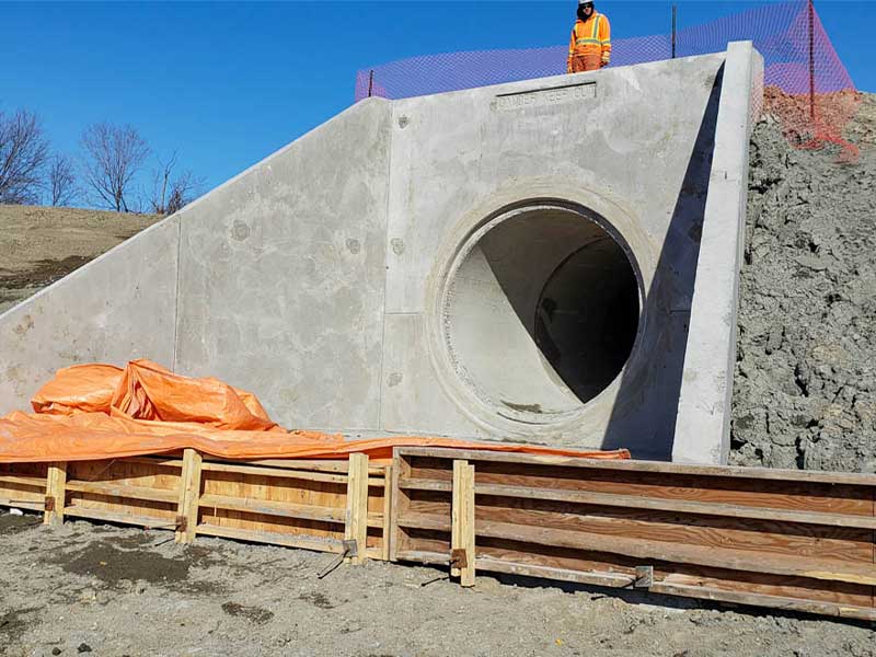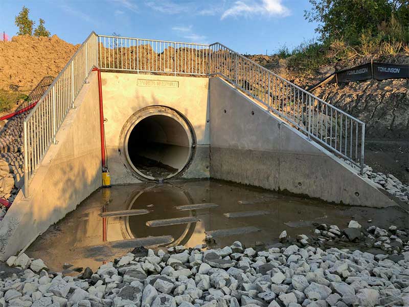 Tomlinson Sewer and Watermain approached MCON for a precast solution to avoid the unpredictability and challenges of curing concrete in the winter elements. By choosing our precast solution, Tomlinson was able to reduce time on site to a couple of days for complete assembly for each headwall. As well as time, labour and subtrade cost savings, Tomlinson also benefited from ease of assembly. “The installation of these headwalls went exceptionally well…, it is an excellent system that you guys have,” said, Garrett Fox – Project Coordinator – Tomlinson Sewer and Watermain.