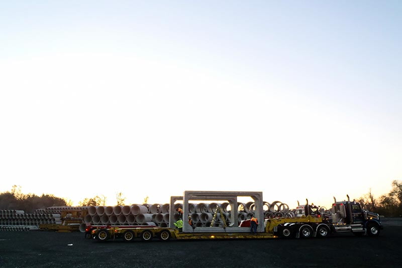 GM BluePlan Engineering designed the steel for 29 standard and four special 6000mm x 2600mm x 350w x 1.318m precast concrete box culvert components. With the increased handling capacity that MCON has today, this culvert could be made in 20 pieces instead of 33, drastically improving production and installation schedules. Prince of Wales Drive is one of the main roads travelling north and southbound to downtown Ottawa. As a result, a weekend road closure was recommended for the installation of this culvert. Working with local brokers, a few trucks were pre-loaded on the Friday afternoon. The remaining trucks were loaded and sent to the site on the Saturday. All 33 pieces were delivered and installed successfully in only one day, enabling Karson to begin quickly sealing the joints and backfilling.