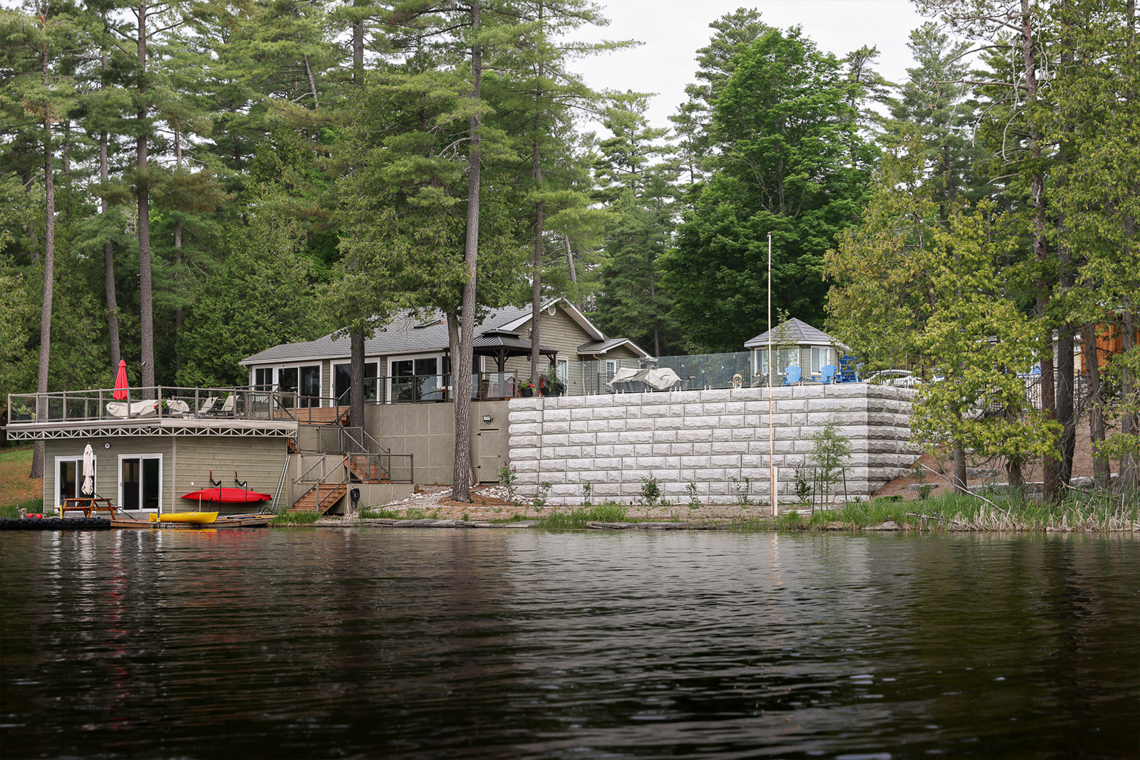 Nestled on the shore of White Lake in Frontenac, Ontario, this stunning residential project needed more than just a typical retaining wall — it required a carefully engineered solution that would protect an upper-level pool from shifting or settling toward the water over time. The homeowner was looking for an aesthetically pleasing yet incredibly strong wall system that could handle the unique site conditions right at the water’s edge. With its unmatched strength and versatility, Stone Strong was the perfect fit.