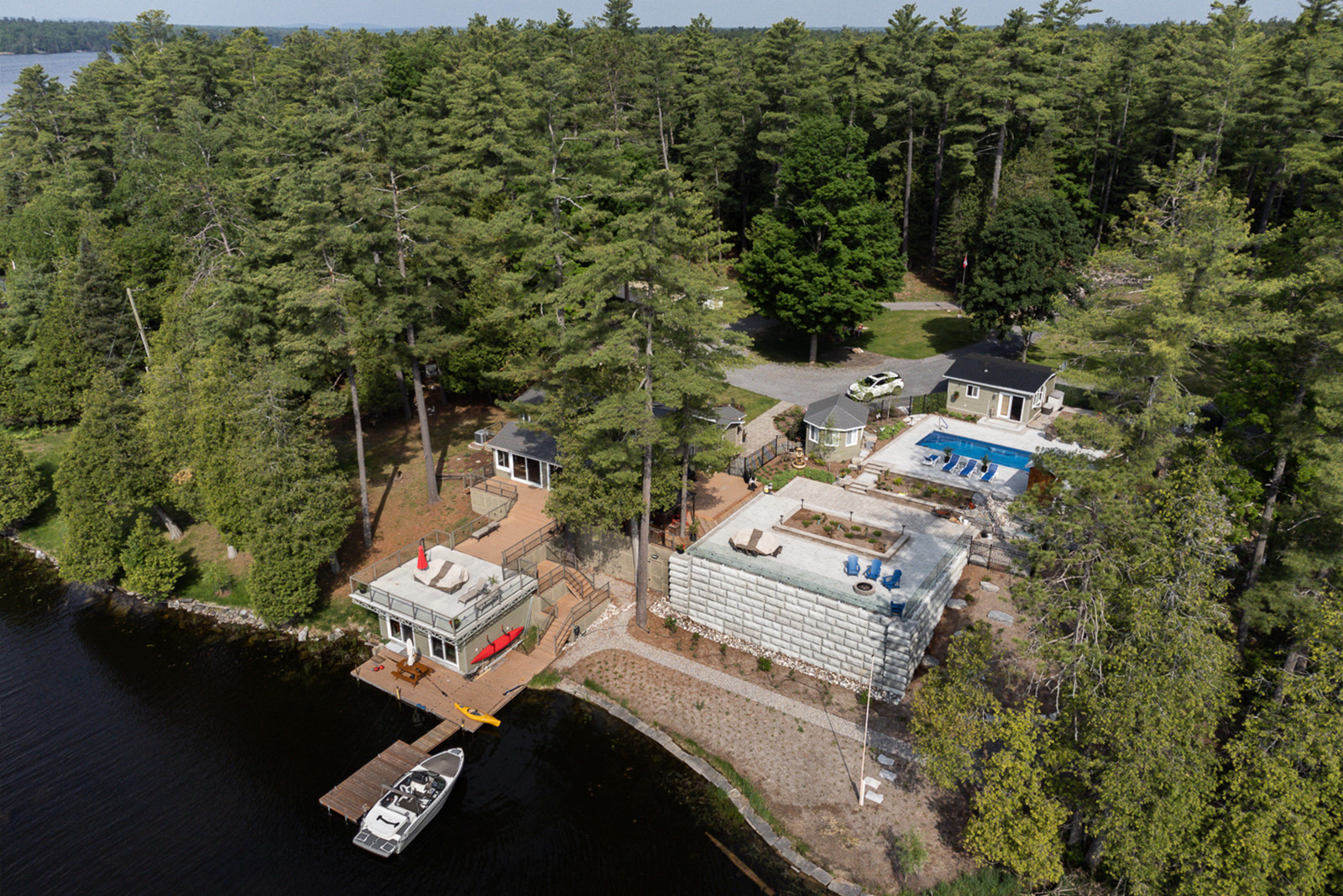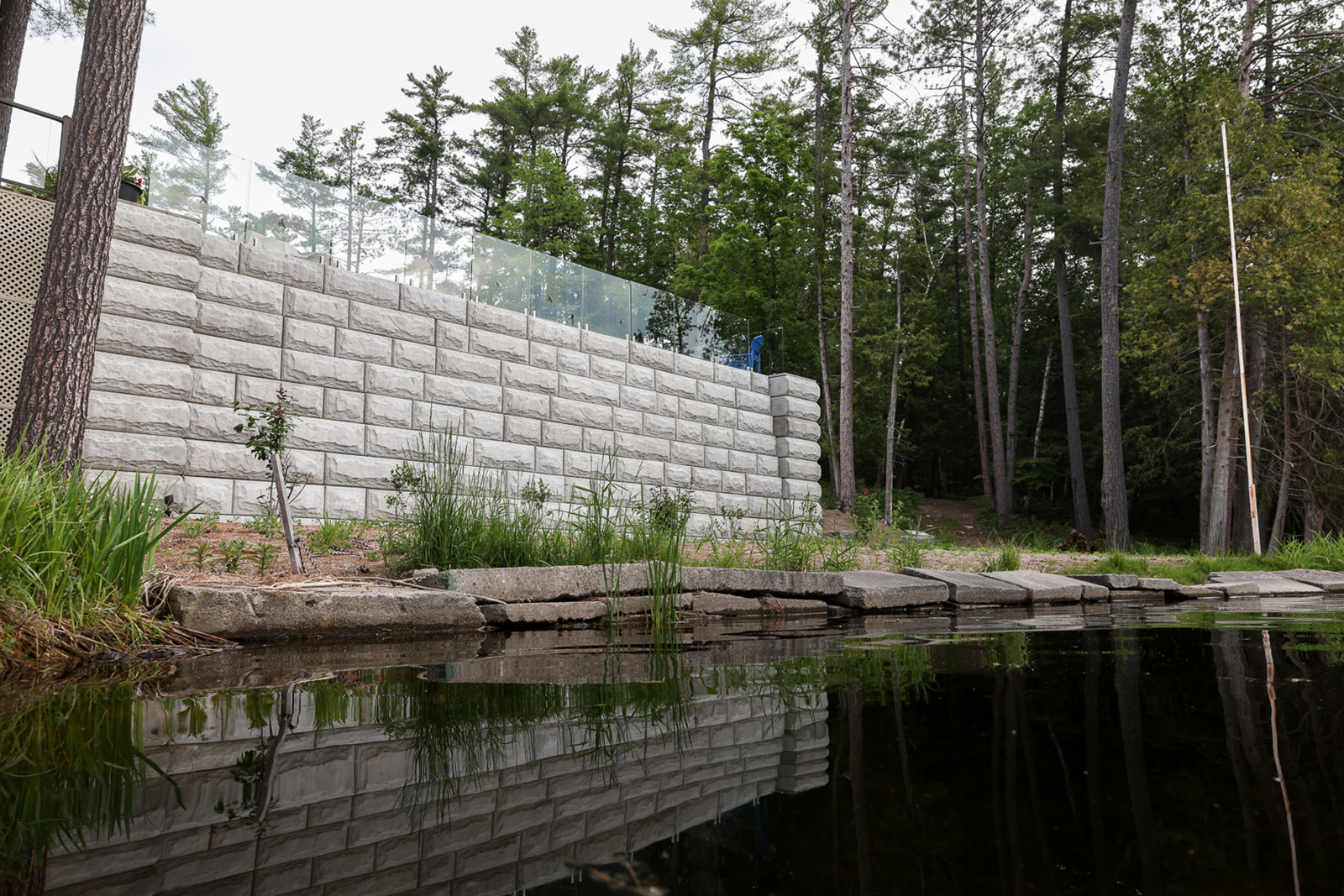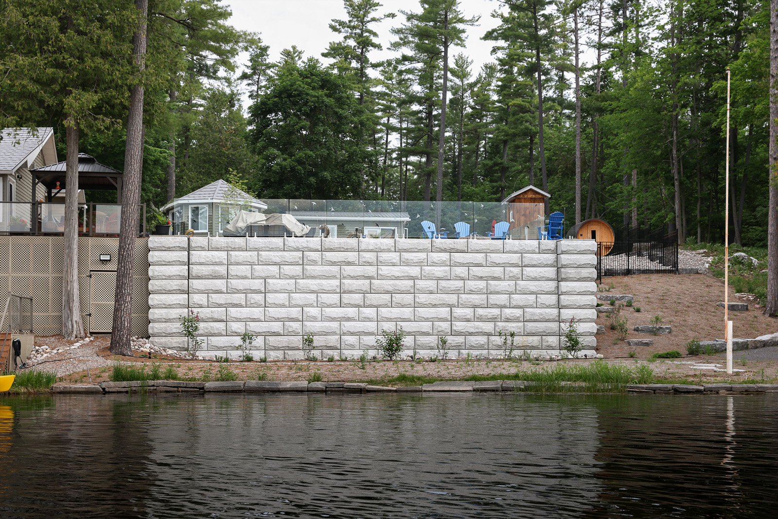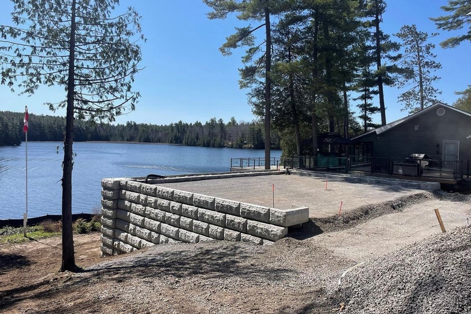 Nestled on the shore of White Lake in Frontenac, Ontario, this stunning residential project needed more than just a typical retaining wall — it required a carefully engineered solution that would protect an upper-level pool from shifting or settling toward the water over time. The homeowner was looking for an aesthetically pleasing yet incredibly strong wall system that could handle the unique site conditions right at the water’s edge. With its unmatched strength and versatility, Stone Strong was the perfect fit.